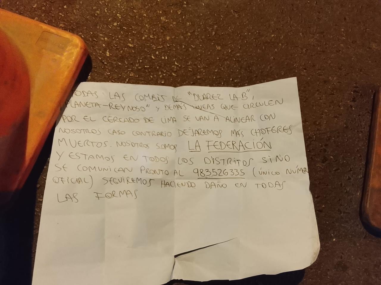 Tras el crimen, los sicarios dejaron un mensaje extorsivo dirigido a los transportistas de la Línea B y otras empresas que operan en el Cercado de Lima. El texto estaba firmado por un grupo criminal que se hace llamar “La Federación”, el cual amenaza con continuar los asesinatos si no se realizan pagos económicos.
